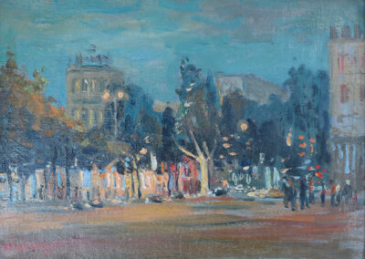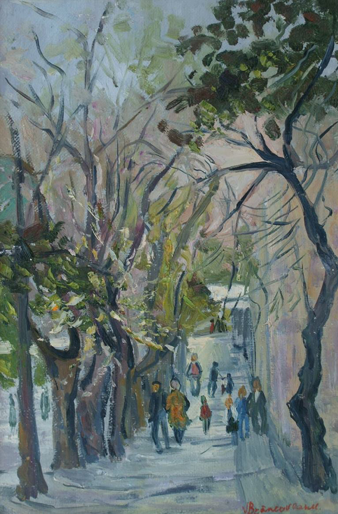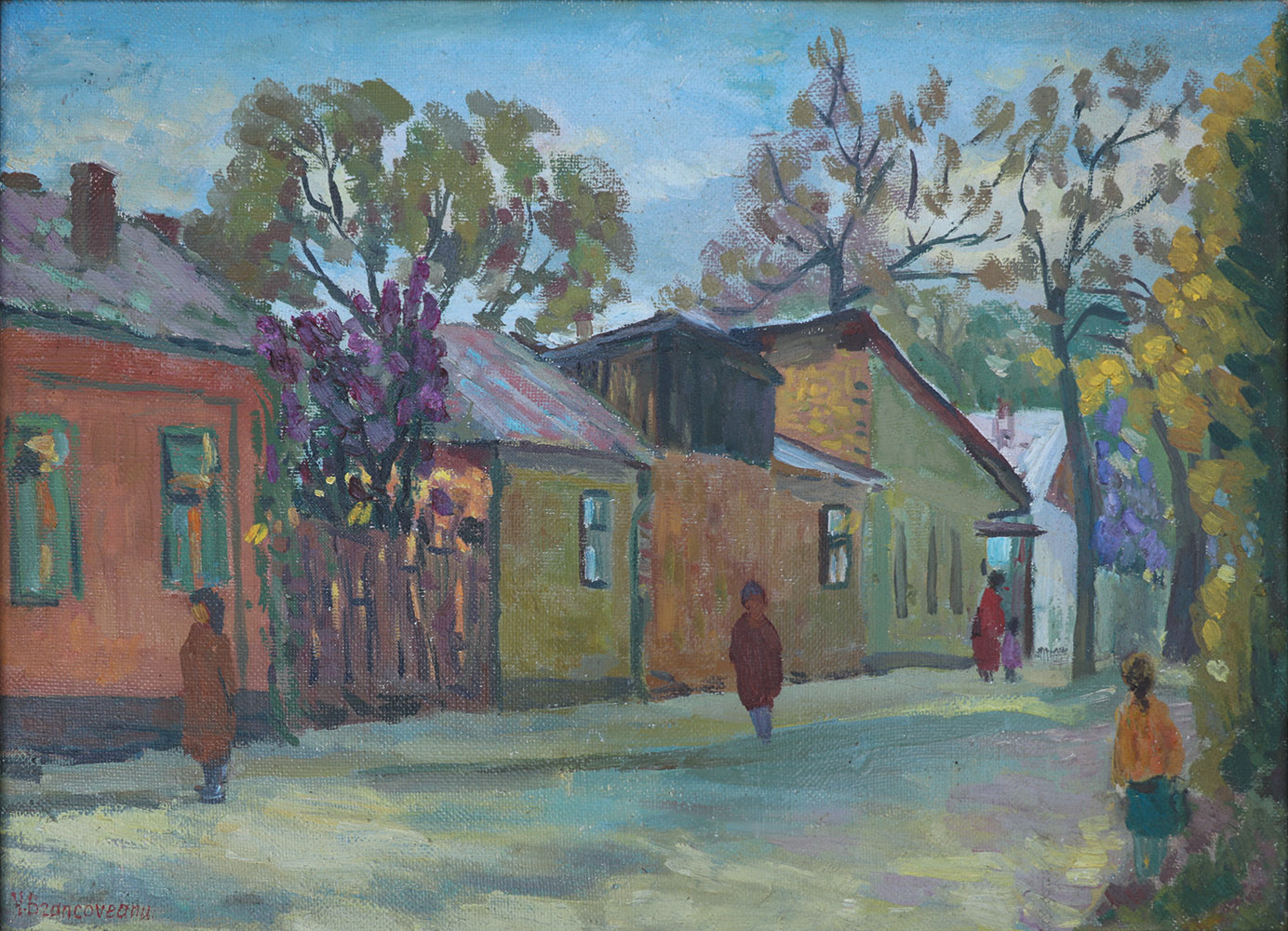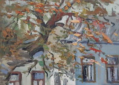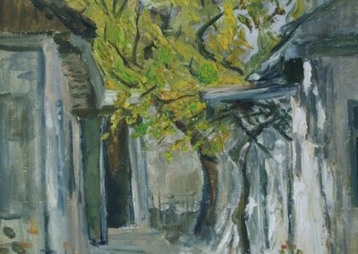 Colț de stradă Bernardazzi, 1988, ulei, pânză pe carton, 500×350 mm.